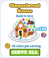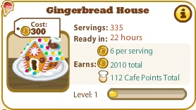 The Gingerbread House is a food released on December 16th, 2009 for the Holiday season. It costs 500 coins, and takes 5 days to cook, the longest of any food.