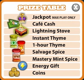 The prize table was modified in June, 2011. Coins and Energy have been replaced by food prizes (100-1000 dishes of a rare food, received as a 1-serving gift in your gift box). You can also receive special delivery parts.